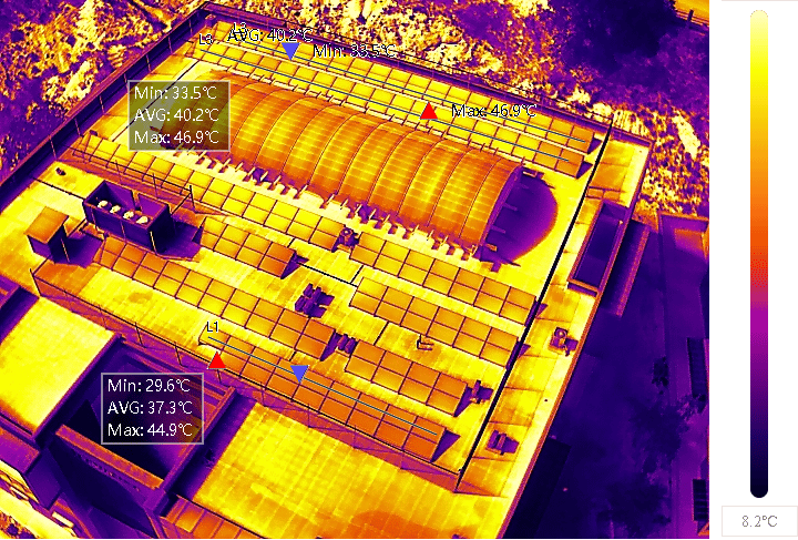 Utilizando el drones Mavic 3 Thermal, se logro inspeccionar los 3000 módulos fotovoltaicos de reciente instalación en 3 campus de la universidad autónoma de Zacatecas. logrando mejores planes de mantenimiento y prevención.